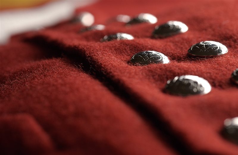 Klaffebuksen og trøya er i svart vadmel, vesten i rødt spesialfarget ullstoff.