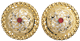 Borer i forgylt sølv med kvit filigran og raud stein i midten. Desse har syhol og kan syast på bunaden. Vert leverte som par.