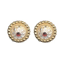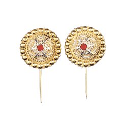 Borenåler i forgylt sølv med kvit filigran og kruse. Med sikerheitsnål på baksida for feste på bunad. Vert leverte som par.