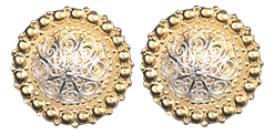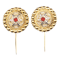 Borenåler i forgylt sølv med kvit filigran og raud stein i midten. Med sikerheitsnål på baksida for feste på bunad. Vert leverte som par.