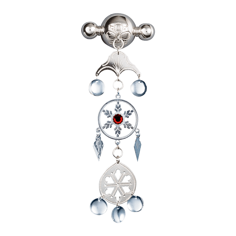 Sølje i kvitt sølv med støypt botn. Nydelege, raslande heng og forgylte trådkantlauv prydar denne sølja. Mykje brukt blant dei som har Sunnmørsbunad og Sunnhordlandsbunad. Finst også i oksidert sølv. Artikkelnr. 200107