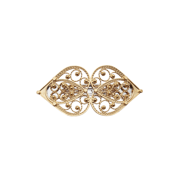 Ei lekker hjarteforma hårspenne i forgylt sølv. Den er inspirert av detaljane på beltespenne til Telemark. Nydeleg, tradisjonell filigrandekor gjer at hårspenna passar til dei fleste bunader, men kan også brukast til kvardags. Finst også i ein større variant. Artikkelnr. 800360.