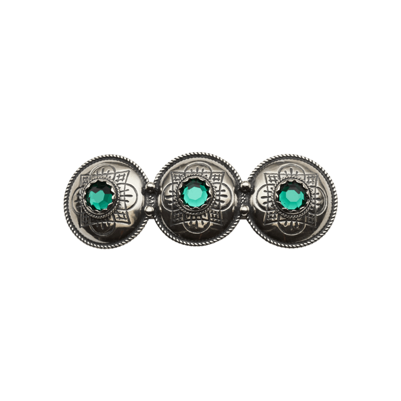 Hårspenne i oksidert sølv med tre steinar i nydeleg grønfarge. Olinenåla til Hallingdal er utgangspunktet til denne hårspenna, men kan nok passa til fleire andre bunader også. Har du bunad med oksidert sølv, gjerne med grøn stein og kanskje noko broderi i grønt, vil denne vera prikken over i’en. Den kraftige klypa sørgjer for godt feste i håret.