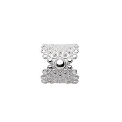 Ein skjerfring i kvitt sølv, laga for å halda silkeskjerfet til bunaden vakkert og trygt på plass. Det graverte mønsteret har same formspråk som anna bunadsølv og skapar eit gjennomført uttrykk.