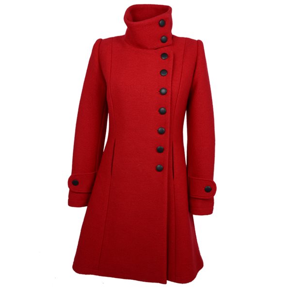 Varm, kledelig kåpe i tovet Merinoull. Skjev lukking og god passform. En av våre bestselgere. Kåpen er "normal" i størrelsen. ( M tilsvarer ca. str. 38 - 40 )