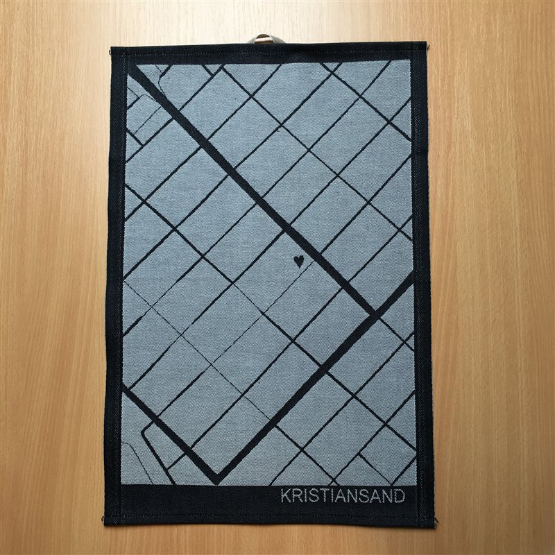 Dette er et spesialdesign, produsert i Sverige av Ekelund Linneväveri, tiltenkt vår butikk i Kristiansand. Her vises bykjernen med sine velkjente vinkelrette gater. Symbolet som markerer sentrums midtpunkt er et hjerte.